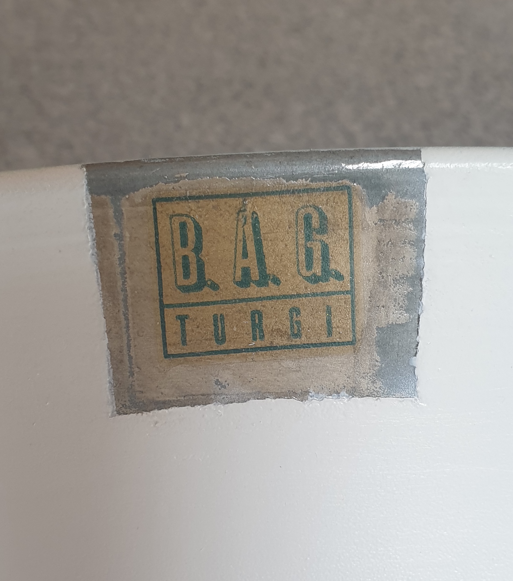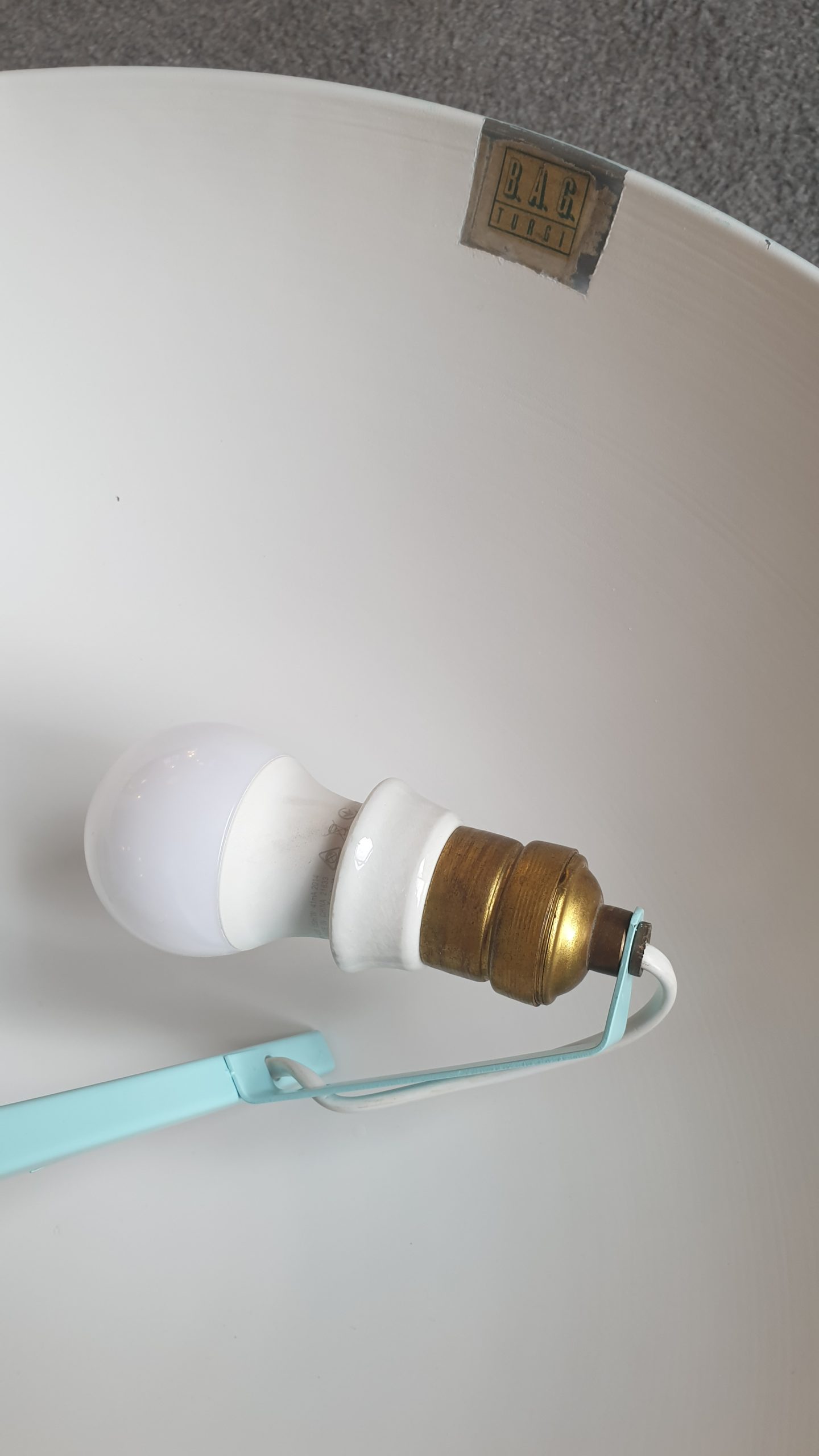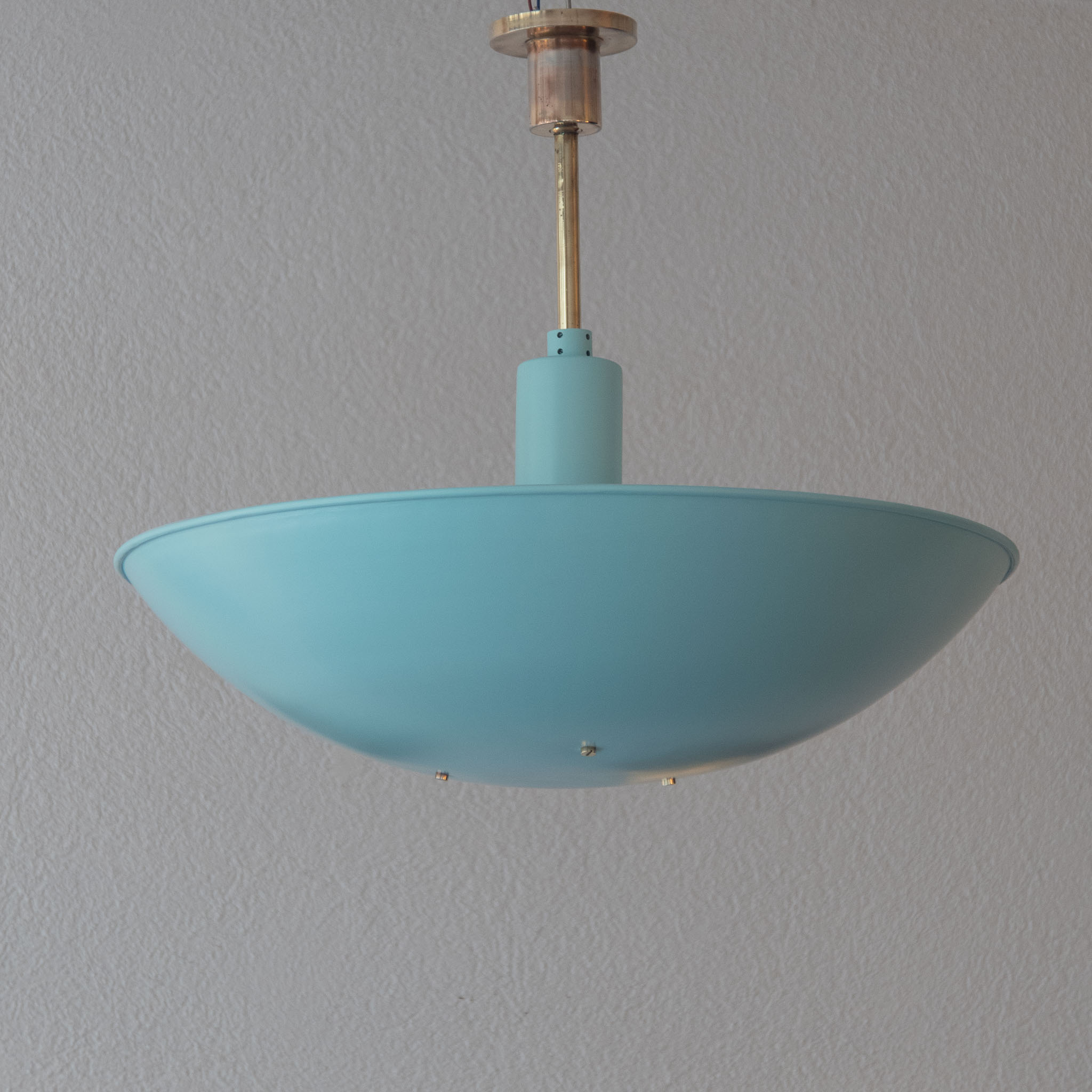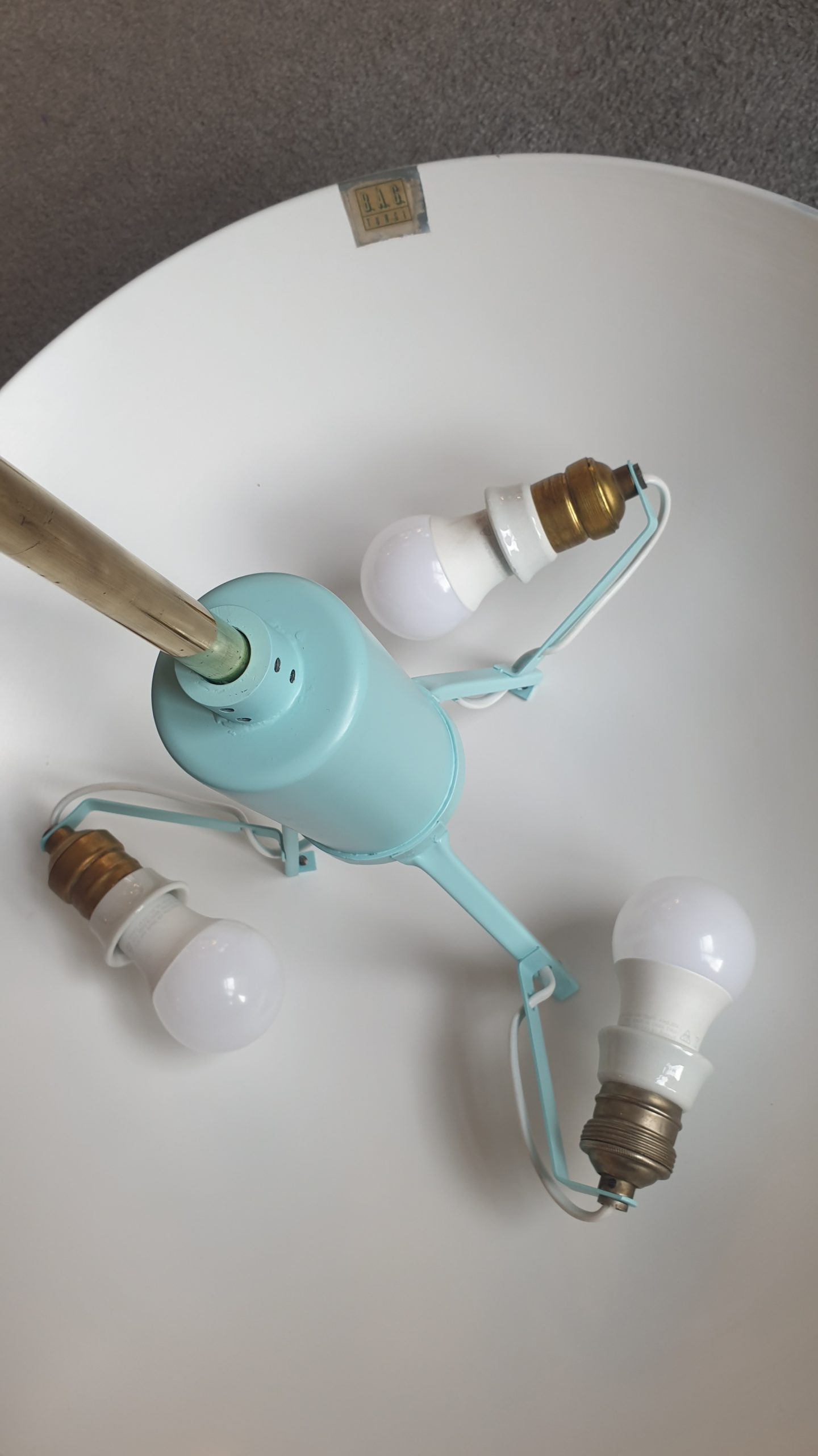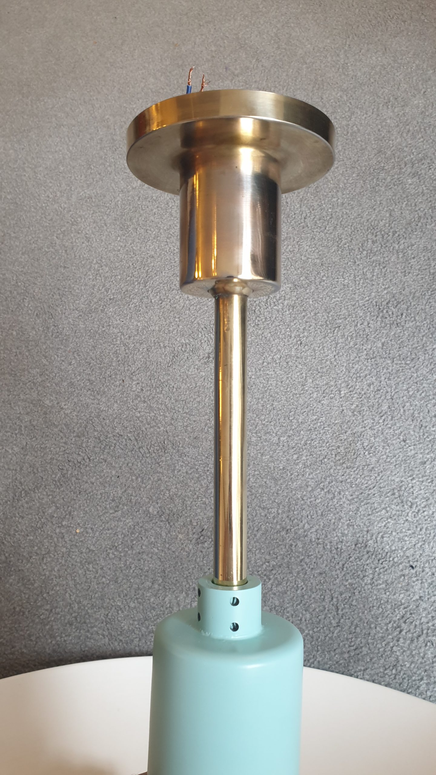 Meticulously restored. When we found it, it was covered with several layers of emulsion paint that a careless painter had slapped on long time ago. The light fixture was stripped, repaired and repainted in its original mint green colour by a bodywork specialist, the bronze was cleaned, and it was then rewired. The original porcelain sockets and the manufacturer’s label have been carefully preserved.