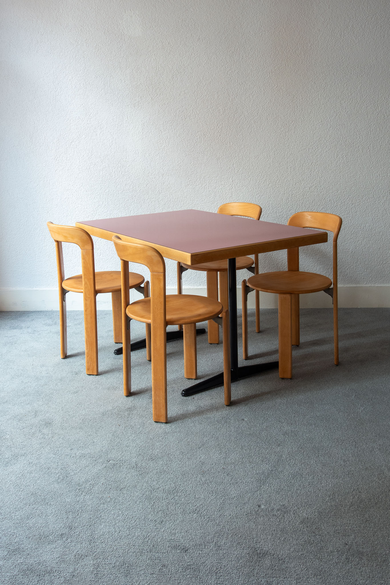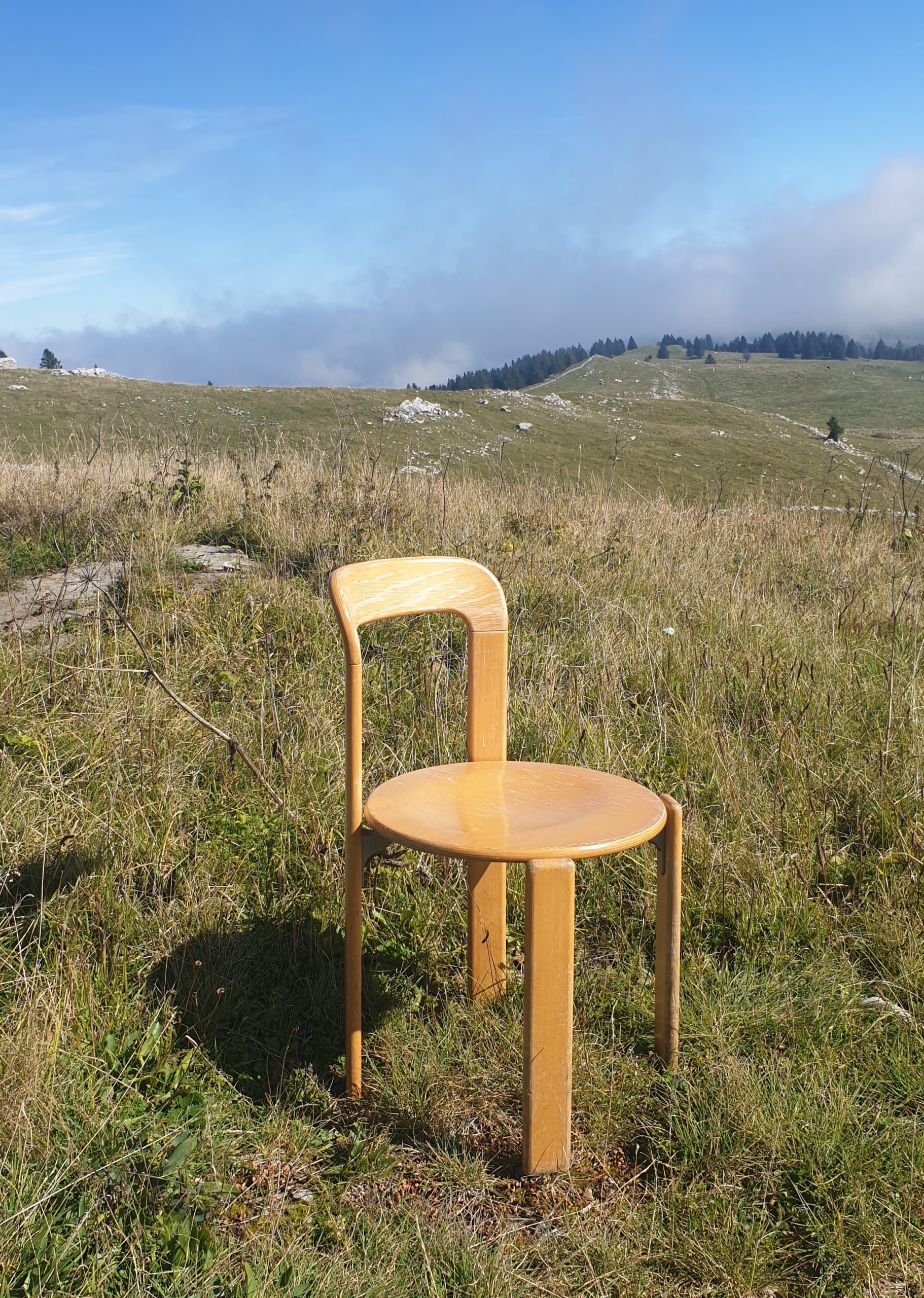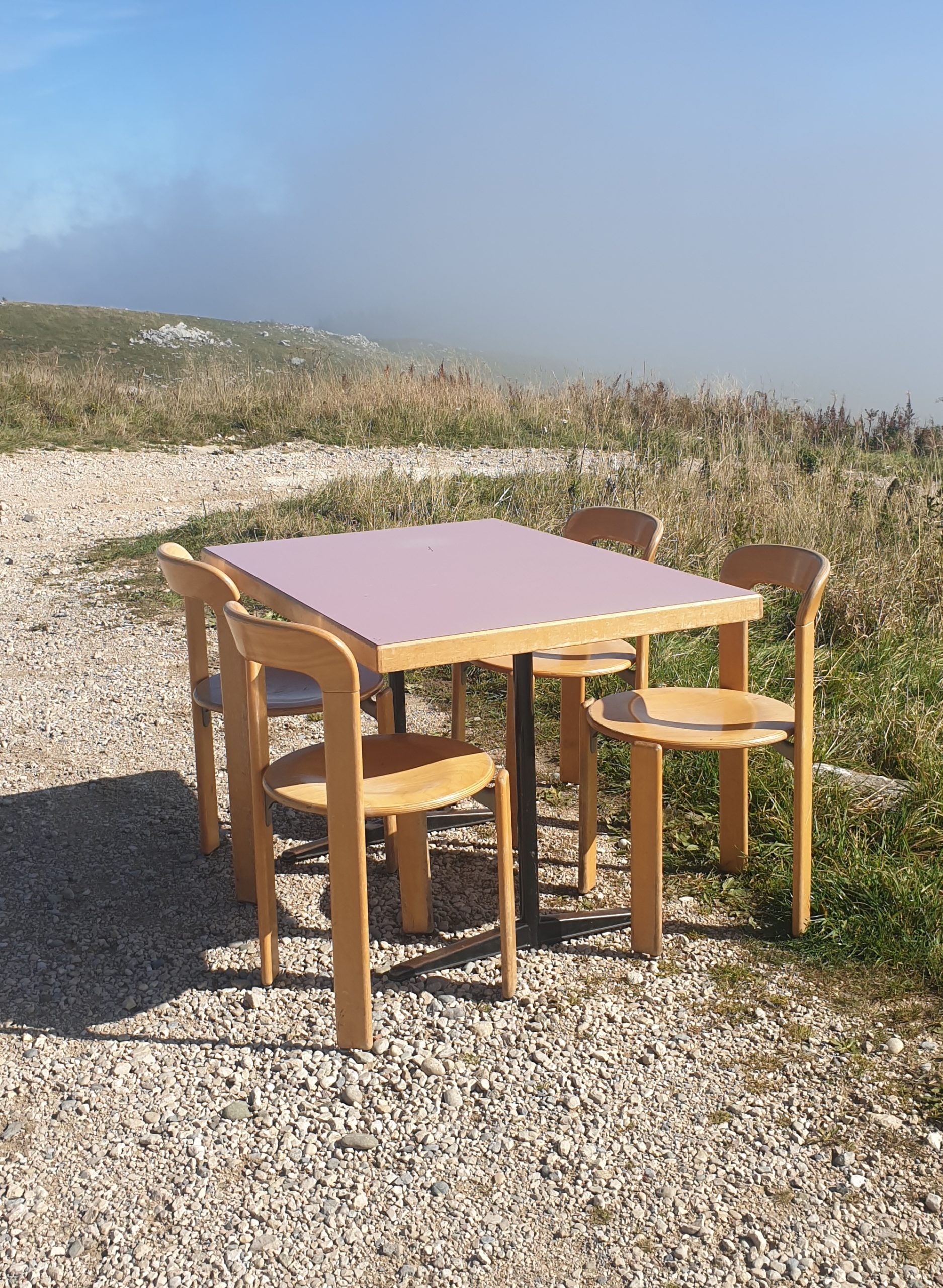 The tables are the work of a local cabinet maker, custom-made to go with the Rey chairs when the mountain restaurant was fitted out in 1984 in Switzerland.