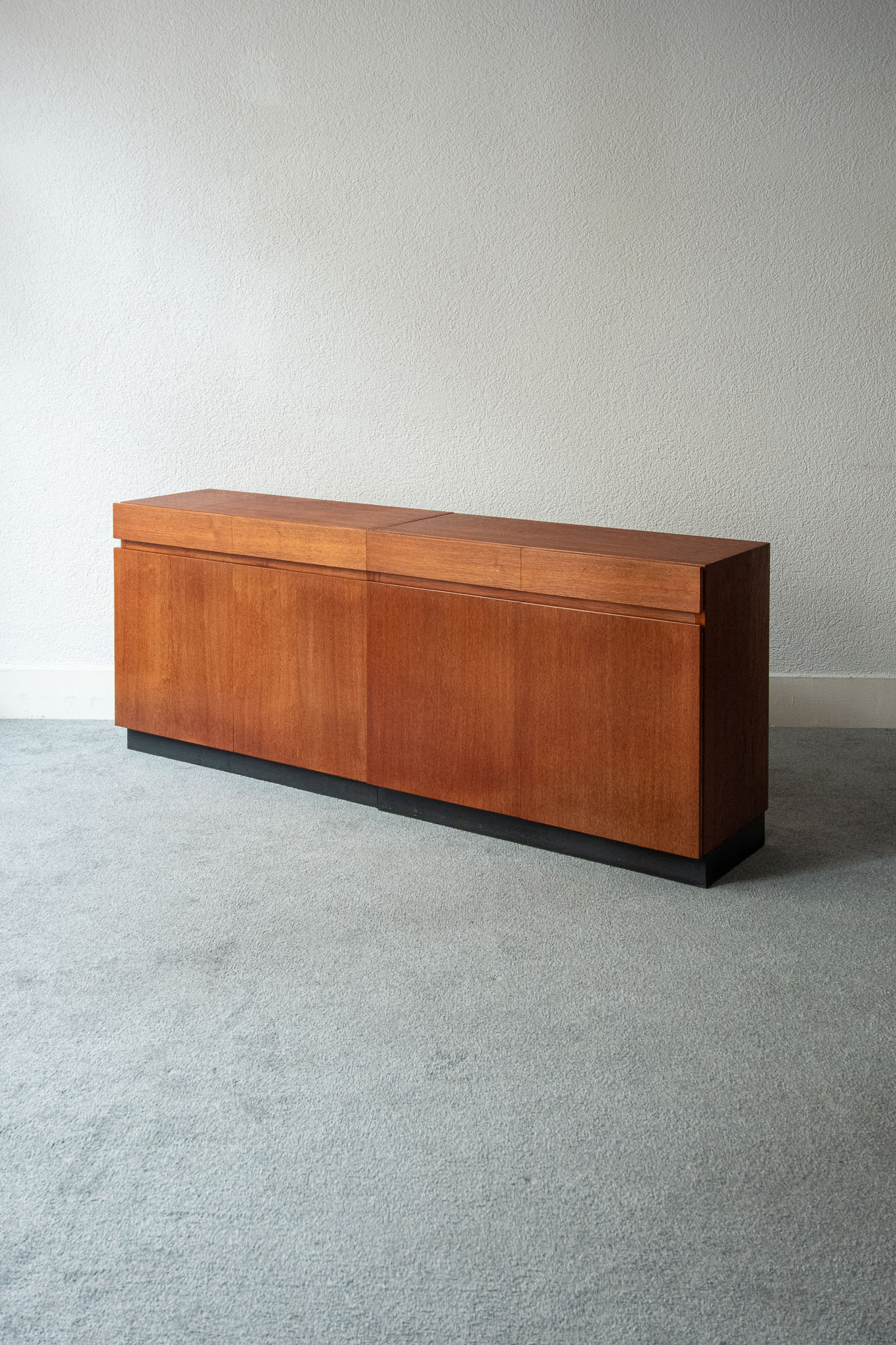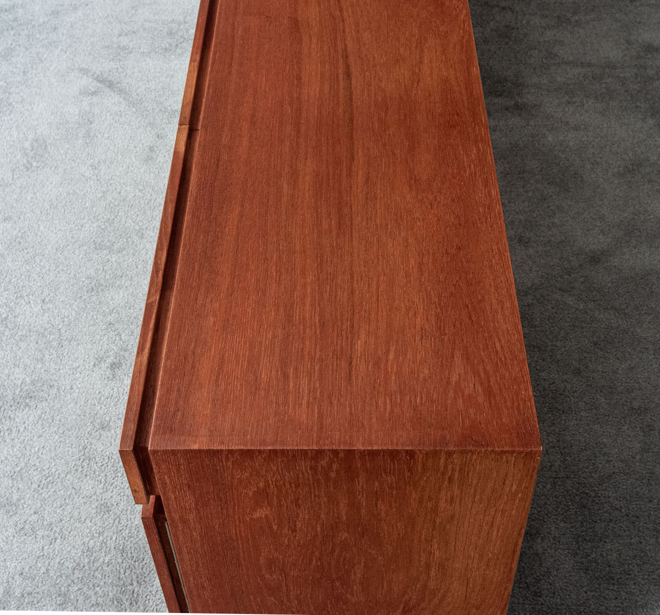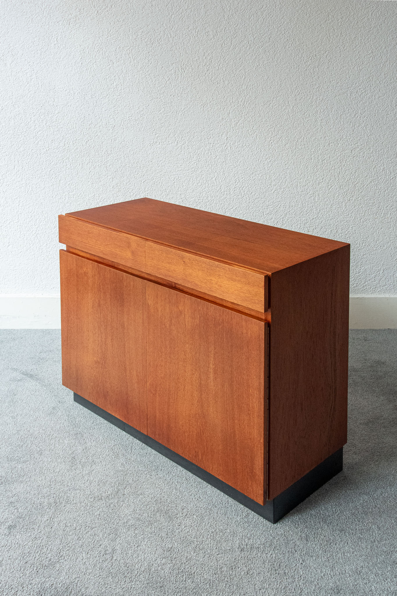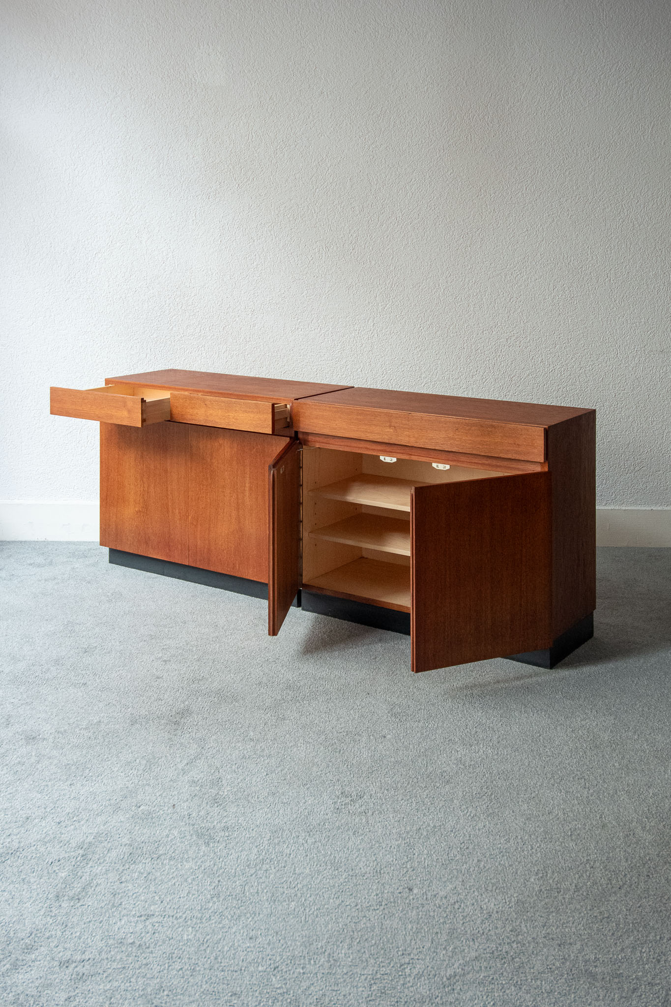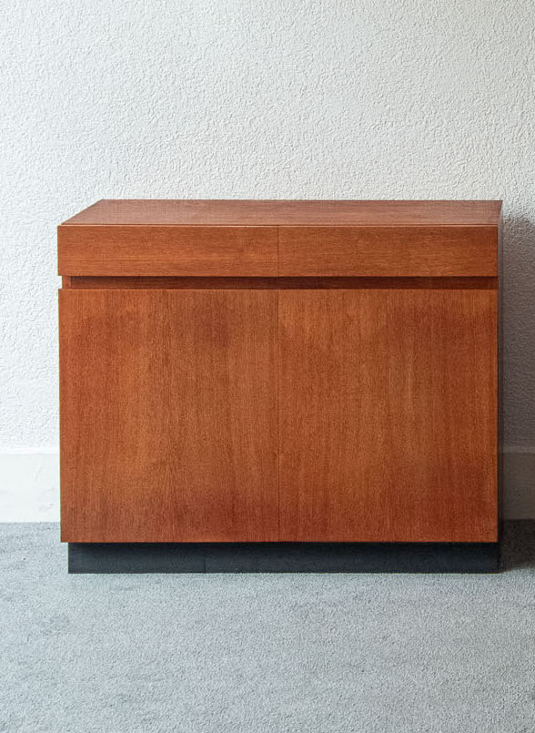 Teak wood, two drawers and two doors opening onto height-adjustable shelves.