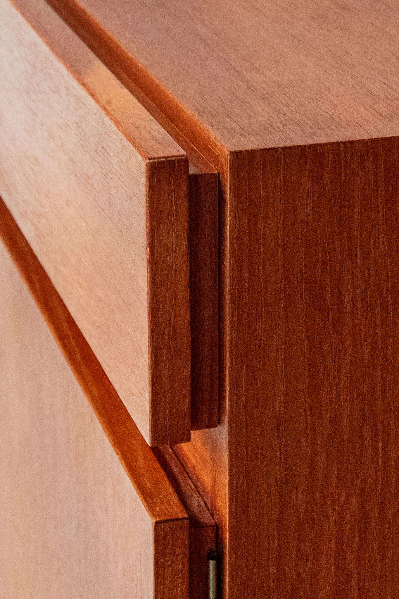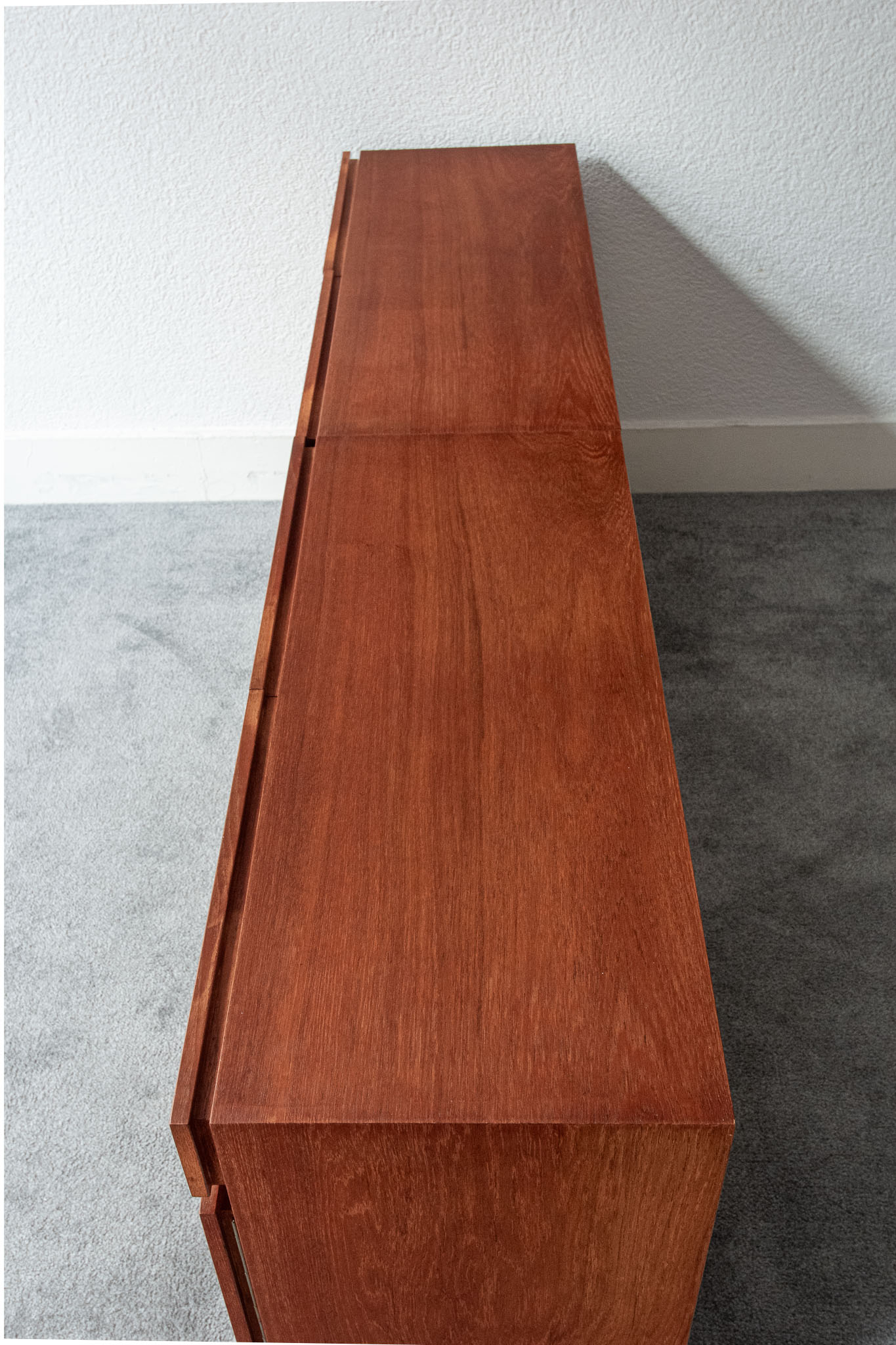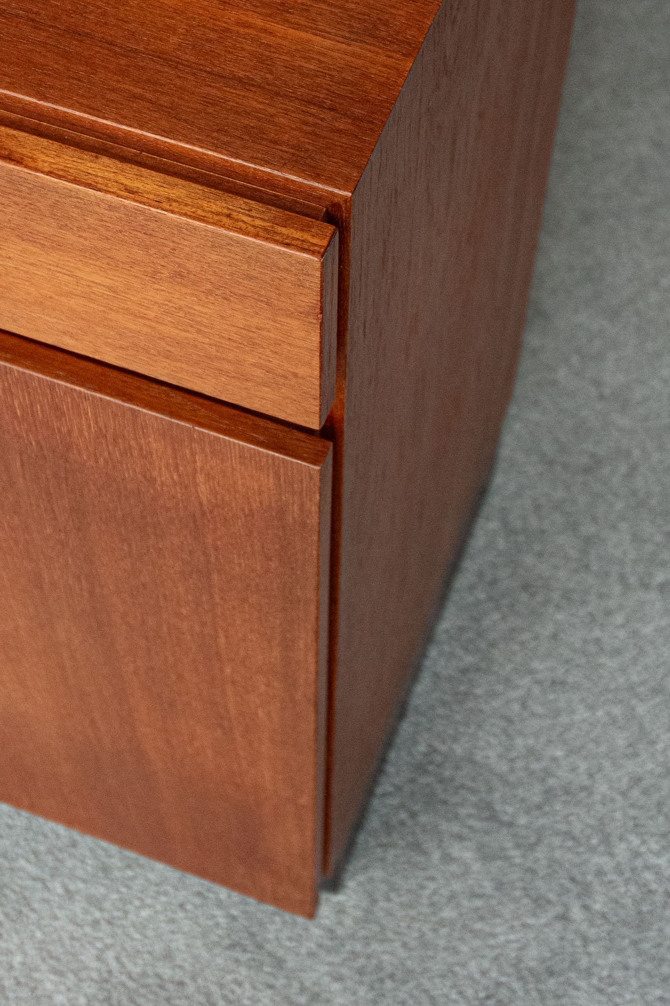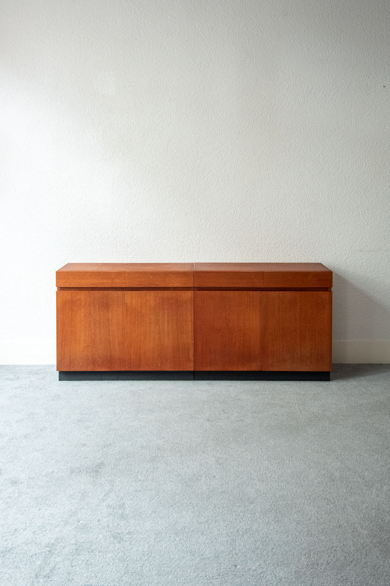 Teak wood, two drawers and two doors opening onto height-adjustable shelves.