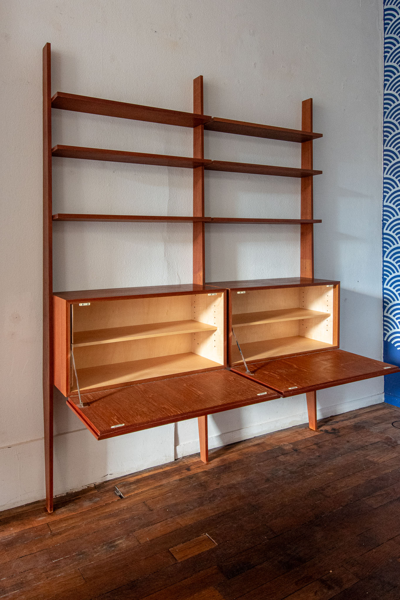 Made entirely of teak, it consists of three vertical sections, two units with drop-down doors and six shelves.