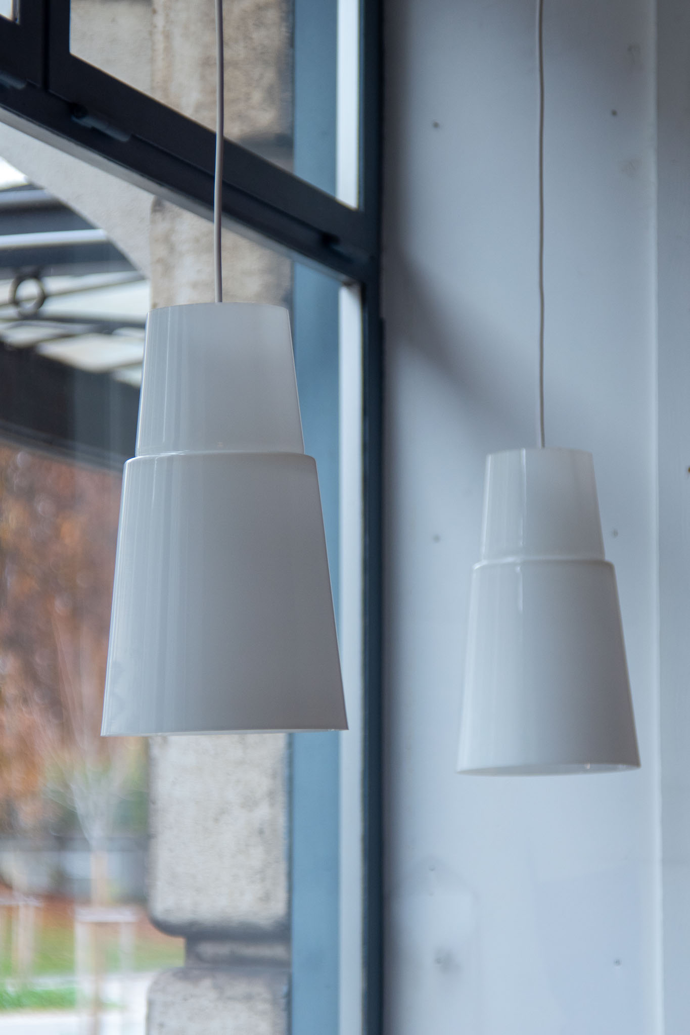 Pair of tubular opaline glass pendant lights, attributed to the Limburg manufactory, Germany, 1960s.