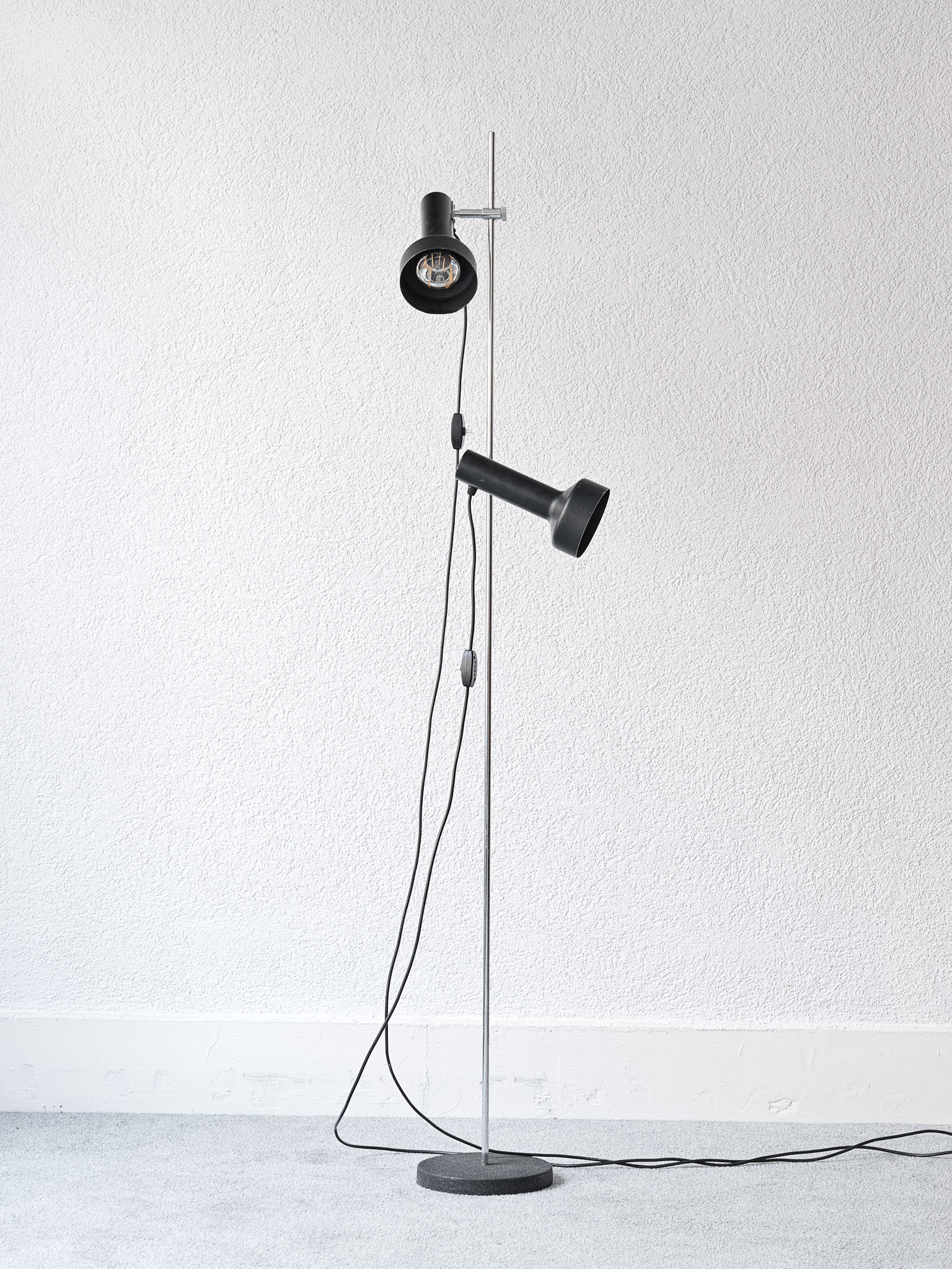 Lampadaire suisse noir des années 60, deux feux orientables dans toutes les directions.